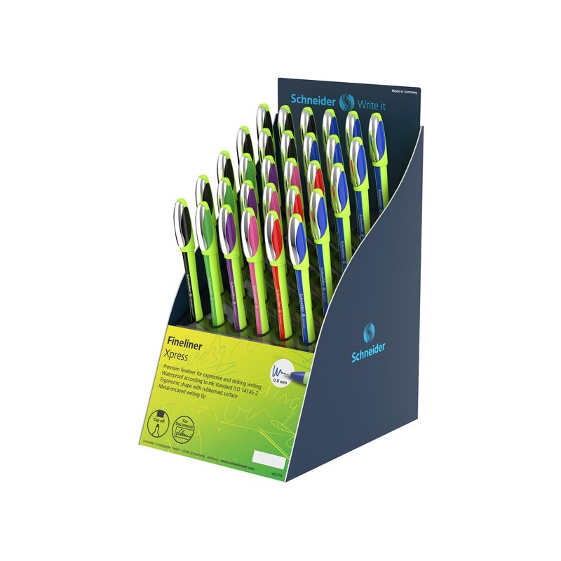 Espositore da banco con 30pz fineliner premium, tratto 0,8mm. 6 colori assortiti (nero,blu,verde,rosso, viola,fucsia)
