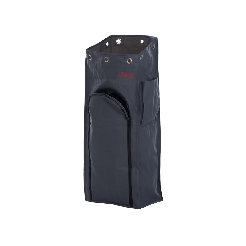 Coprisacco tessile di alta qualità con fissaggio a occhiello, due tasche e apertura frontale con doppia zip per completa copertura di sacchi da 70 litri. Compatibile con il carrello di pulizie professionale VoleoPro Standard cod 98151.