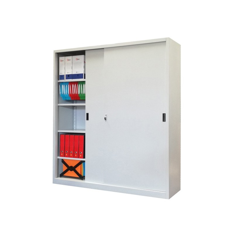 Armadi con struttura portante in lamiera d’acciaio di prima scelta presso piegata e adeguatamente rinforzata spessore 8/10. Le ante scorrono nelle guide del cappello mediante staffe zincate con cuscinetti a sfera rivestiti di nylon. Maniglie ad incasso in materiale plastico. Ripiani regolabili in altezza e predisposti per l’inserimento di cartelle sospese. Ripiani con portata di 50 Kg ciascuno. Serratura di sicurezza con chiusura centralizzata (2 chiavi in dotazione). Verniciatura con polveri epossidiche. Colore Grigio (RAL 7035).