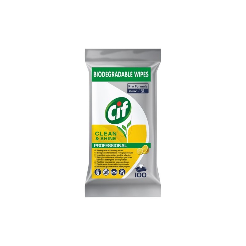 Cif Pro Formula Clean & Shine sono salviette detergenti e igienizzanti, ideali per una pulizia efficace e veloce di tutte le superfici dure, rimuovendo anche lo sporco meno visibile. Sono la soluzione facile da usare e veloce per pulire anche le superfici difficili da trattare, quali interruttori, telecomandi, maniglie e cestini della spazzatura. Lo smaltimento dopo l’uso è facile e veloce. Utili anche per tutte le altre superfici dure e lavabili, come lavandini, fornelli, frigoriferi, bagni, sanitari, tavoli e sedie. Sono realizzate al 100% in viscosa, che è biodegradabile e studiata per ammorbidire, sollevare e rimuovere velocemente lo sporco, lasciando un fresco profumo di pulito. Istruzioni per l’uso: 1. Aprire la confezione e sollevare l’adesivo per metà. 2. Passare la salvietta sulla superficie per rimuovere lo sporco. Non è necessario il risciacquo. 3. Richiudere il pacchetto dopo l’uso per evitare che il prodotto si asciughi.
