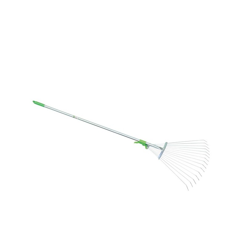 Scopa a 15 denti in metallo per erba e foglie. Manico 120cm, raggera dei denti regolabile da 17 a 55cm. Ideale per la lavorazione del terreno, in agricoltura, nell’orto e nel giardino.