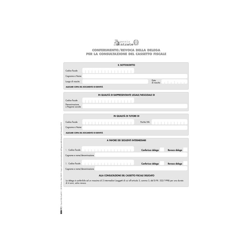 Modulo per il conferimento/revoca delle deleghe all’utilizzo del cassetto fiscale delegato. Formato 29,7x21cm.
