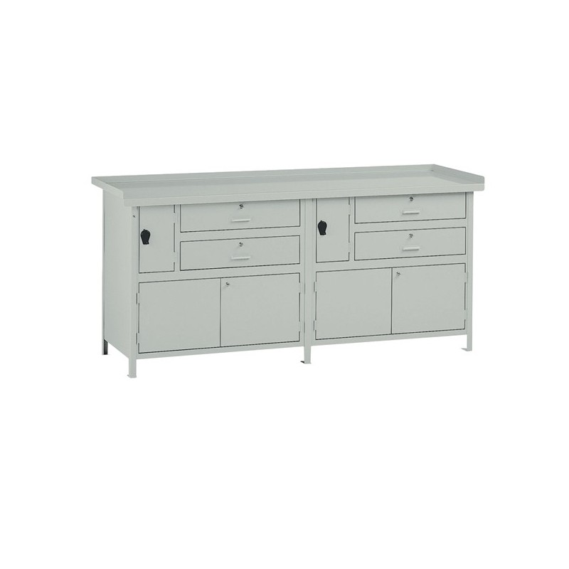 Banco da lavoro in lamiera con piano spessore 25/10, 4 cassetti scorrevoli su guide con cuscinetti a sfera e serratura, 2 vani laterali con naselli lucchettabili e 2 vani inferiori con sportelli. Portata kg.1000.Verniciatura a polvere grigio RAL 7038. Dimensioni: 200Lx67Px90Hcm. Portata 1000kg (intesa per carichi uniformemente distribuiti). Fornito montato.
