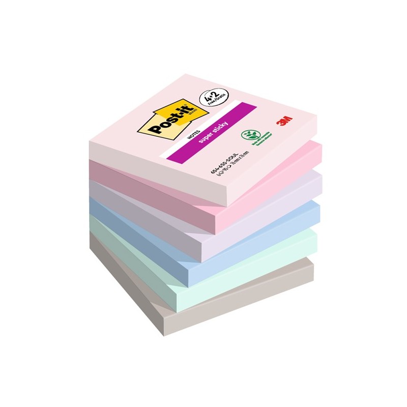 Blocchetti da 90 foglietti riposizionabili assortiti nei colori. Hanno una presa maggiore e durano più a lungo grazie alla forza adesiva doppia rispetto ai foglietti Post-it tradizionali. Perfetti per superfici verticali o con scarsa aderenza quali monitor di computer, porte e pareti. Adesivo realizzato al 60% con risorse rinnovabili da piante con ricrescita annuale.Colori Soulful assortiti: rosa sale, rosa fenicottero, lavanda, blu jeans, verde menta fresca e grigio pietra.