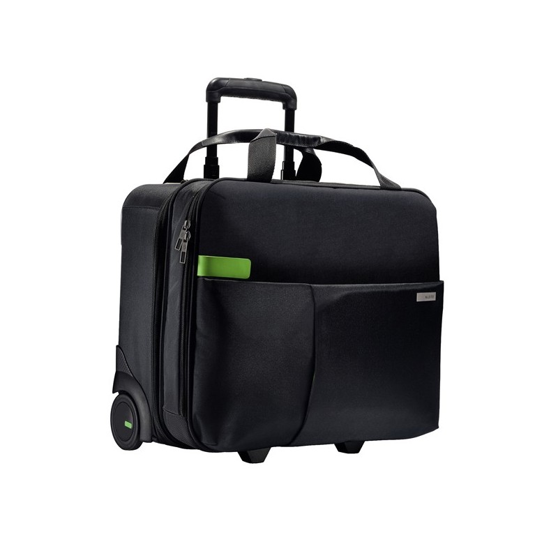 Trolley leggero con due tasche laterali principali spaziose e una piccola tasca anteriore. Consente di separare gli strumenti di lavoro dagli effetti personali. Trasporto confortevole a 2 ruote con sistema di scorrimento silenzioso e carrello di traino a doppio tupo. Maniglie imbottite in vera pelle utilizzabili anche come fascia di fissaggio a un secondo trolley. 19 tasche tra cui una tasca anteriore ad accesso rapido per mini tablet o lettore ebook. Spaziosa tasca a rete per l'adattatore e i cavi.
