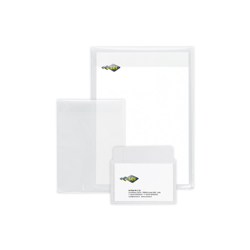 Buste in polipropilene liscio, alto spessore, con patella. Adatte a contenere tessere, documenti, fotocopie, istruzioni, carte di credito e biglietti da visita. Formato contenuto: 250x350mm.
