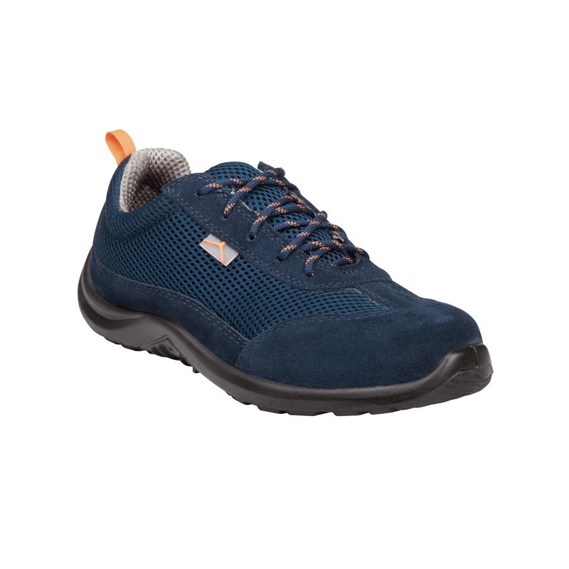 Scarpa bassa S1P con tomaia in pelle scamosciata e poliestere «mesh». Soletta di pulizia staccabile preformata (poliestere su EVA). Suola iniettata - PU mono-densità. Puntale in metallo. Categoria DPI: 2. Certificazione CE. Conformità alle norme EN ISO 20344:2011 e EN ISO 20345:2011.