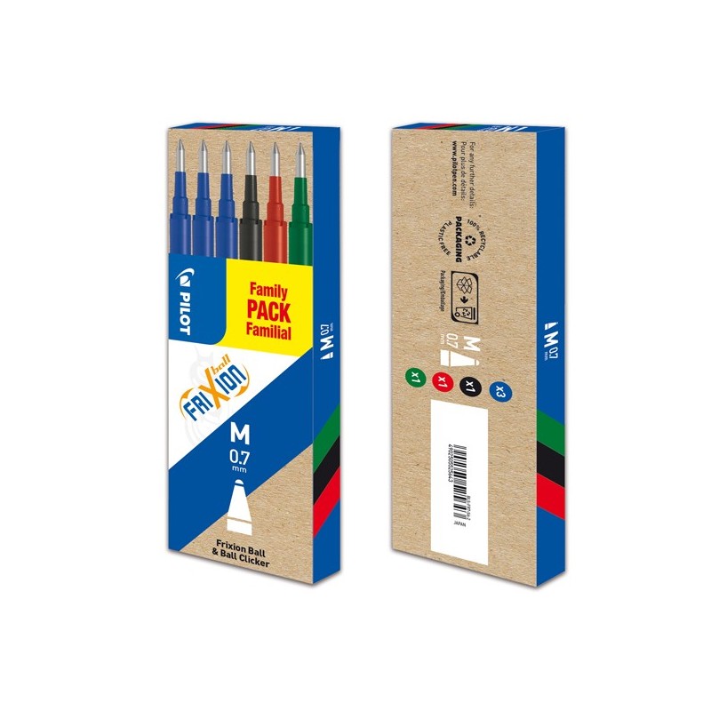 Set 6 Refill per FRIXION ball e clicker. Punta 0,7mm. Astuccio colori assortiti: 3 blu,1 nero, 1 rosso, 1 verde.