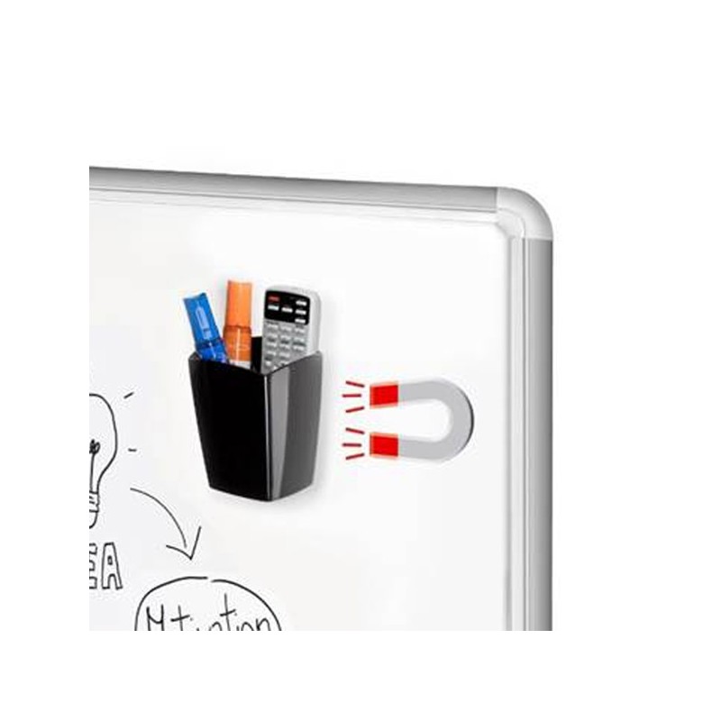 Robusto portapenne a 2 scomparti, dotato di una potente calamita. Ideale per lavagne bianche o superfici metalliche. Portata fino a 300g. Capacità fino a 10 pennarelli. 100% polystirene riciclabile. Dimensioni.: 78 x 74 H 95 mm. Non compatibile con lavagne magnetiche in vetro.