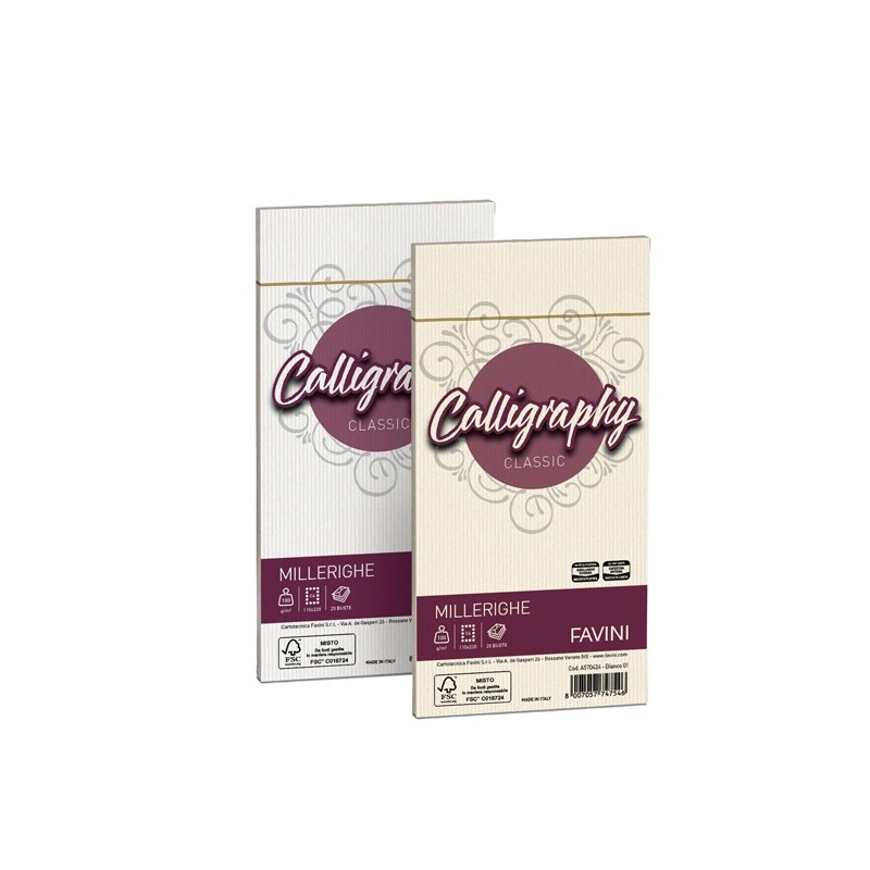Busta adesiva con strip da 100 grammi in carta Calligraphy con tramatura millerighe. Formato 110x220mm.
