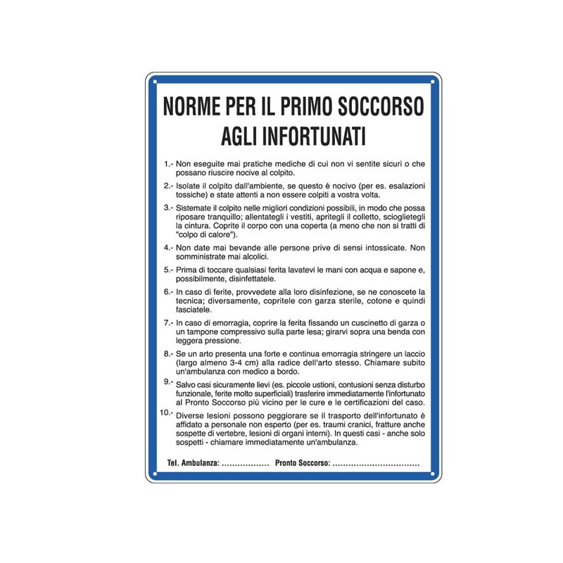 Cartello segnalatore - 33,3x47 cm - NORME DI PRIMO SOCCORSO AGLI INFORTUNATI - alluminio - Cartelli Segnalatori