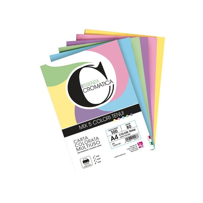 Risma 100 fogli, carta da 80gr, assortimento mix 5 colori tenui.