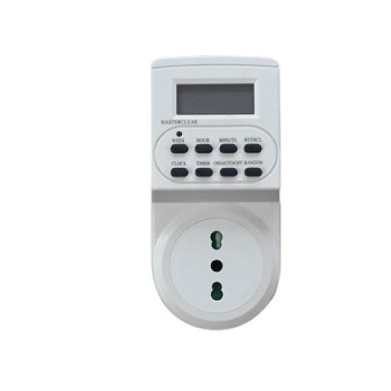 Timer digitale settimanale adatto per l'accensione e lo spegnimento di qualsiasi apparato collegato alla rete elettrica. Impostazione settaggio: 10 programmi ON/OFF giornalieri e 160 settimanali. Tempo di impostazione minimo: 1 minuto. Tempo di impostazione massimo: 7 giorni. Programmazione orario: 12/24 ore. Batteria di back-up Ni-MH 1,2 V. Durata maggiore di 100 ore. Carico massimo: 220-240 V, 3600 W. Presa 10/16 A.