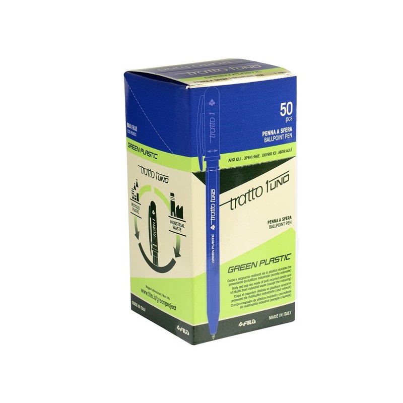 Tratto 1 Green Plastic, la nuova Tratto 1 tutta green! Corpo e cappuccio sono realizzati sia con plastica riciclata che con plastica da riutilizzo industriale. Scrittura scorrevole e partenza immediata, traccia media 0,5 mm in 3 colori di scrittura blu, rosso e nero. La punta fuoriesce tramite la rotazione del cappuccio.