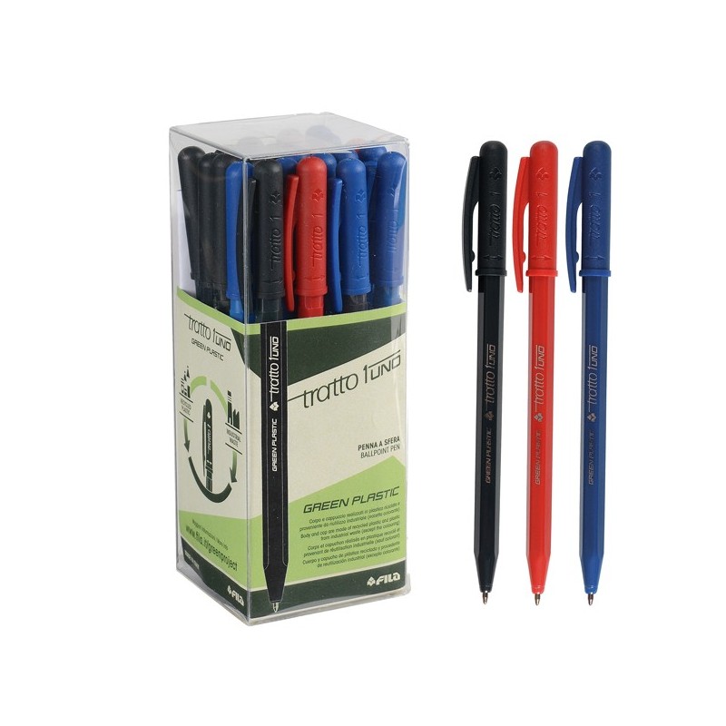 Tratto 1 Green Plastic, la nuova Tratto 1 tutta green! Corpo e cappuccio sono realizzati sia con plastica riciclata che con plastica da riutilizzo industriale. Scrittura scorrevole e partenza immediata, traccia media 0,5 mm in 3 colori di scrittura blu, rosso e nero. La punta fuoriesce tramite la rotazione del cappuccio. Confezione da 24 penne in 3 colori assortiti.