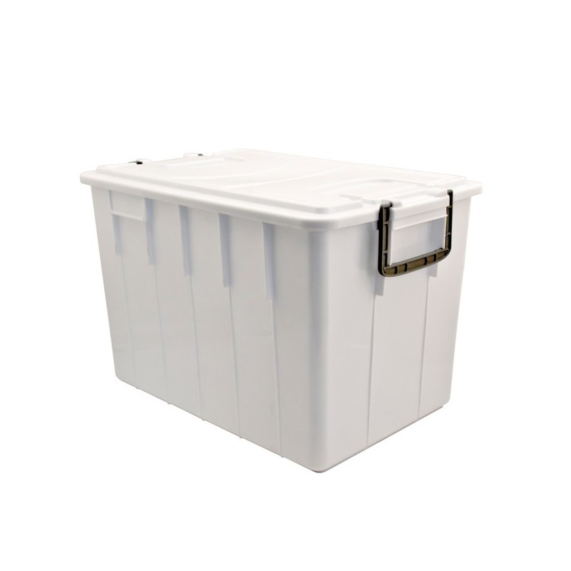Contenitori food box con coperchio. In polipropilene riciclabile. I contenitori sono sovrapponibili con coperchio e impilabili senza coperchio. Dotati di manici. Idonei al contatto con alimenti. Colore bianco. Dimensioni: L58 x P38 x H38cm - 60 litri.