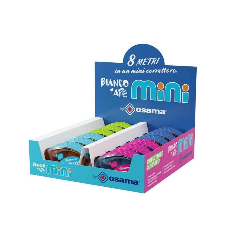 Correttore a nastro mini piccolo e compatto. Pratico design a forma di topolino. Lunghezza nastro 8mt. Grip in gomma zigrinata antiscivolo e corpo trasparente colorato.
