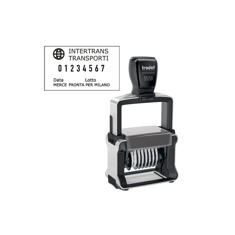 Timbro numeratore autoinchiostrante. Design moderno ed ergonomico con robusta struttura in acciaio. Bande con numeri da 0 a 9 e simboli. 8 colonne da 5mm. Piastra di stampa 56x33mm. Tampone di ricambio 6/56.