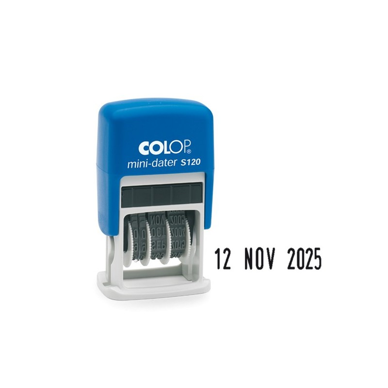 COLOP Mini datario S120. Datario autoinchiostrante a altezza caratteri mm 3,8. Fusto antiurto in ABS. Tampone ricambio E/10 colore nero.