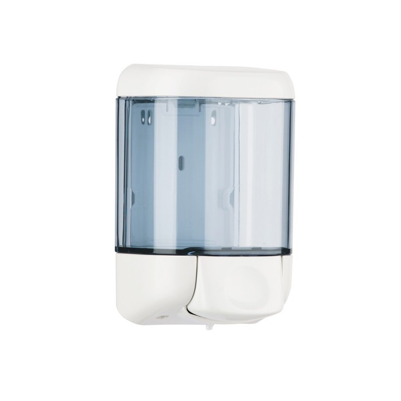Dispenser sapone liquido con erogazione a pulsante. Capacità 1 litro. Dimensioni 12,8x11,2x20,5cm. Il dispenser è dotato di coperchio con serratura