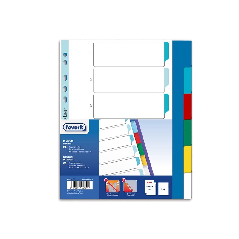 Divisori realizzati in polipropilene da 120my per un uso intensivo. Foratura universale. Frontespizio scrivibile. 6 tacche neutre colorate. Formato 23x29,7cm. Made in Germany