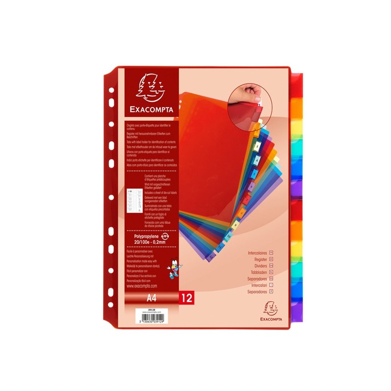 MARCHIO : Exacompta MATERIALE : Ppl SPESSORE : 20/100E FORMATO ESTERNO : 22x30 cm FORMATO : A4 TIPO DI PRODOTTO : Intercalari TIPO : Neutri NUMERO POSIZIONI : 12