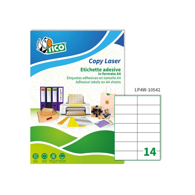 Etichetta adesiva LP4W - permanente - 105x42,3 mm - 14 etichette per foglio - bianco - Tico - conf. 100 fogli A4
