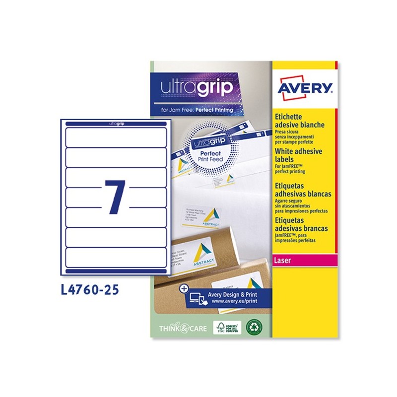 Confezione da 25 fogli in formato A4 di etichette in carta bianca coprente adesiva permanente. Ogni foglio continene 7 etichette rettangolari con angoli tondi nel formato 192x38mm. Stampa Laser monocolore, Laser a colori, Inkjet.