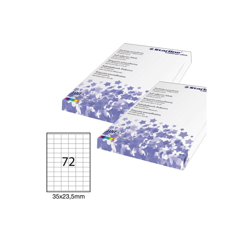 Etichette adesive bianche STARLINE utilizzabili con stampanti laser, inkjet o fotocopiatori. Adesivo permanente. Prive di margne di sicurezza lungo il perimetro. In scatola da 100 fogli formato A4.