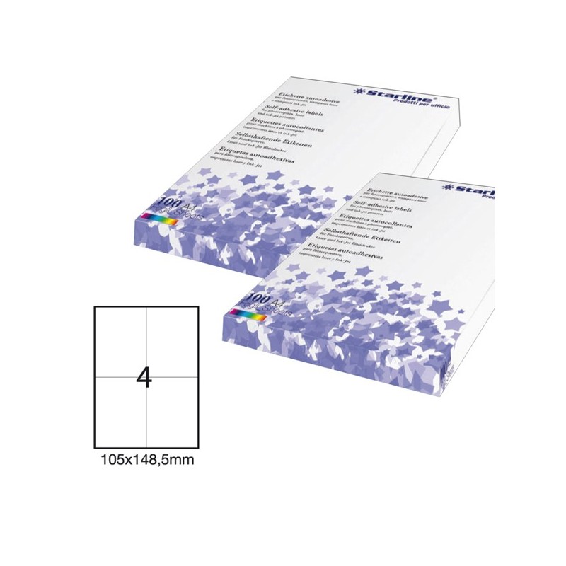 Etichette adesive bianche STARLINE utilizzabili con stampanti laser, inkjet o fotocopiatori. Adesivo permanente. Prive di margne di sicurezza lungo il perimetro. In scatola da 100 fogli formato A4. Caratteristiche di questo articolo: • Codice: STL3037 • Colore: bianco • Adesivo: permanente • Angoli etichette: vivi a 90° • Dimensione etichetta: 105x148mm • Nr. etichette per foglio: 4 • Nr. etichette per scatola: 400 • Stampa: laser, inkjet, copia