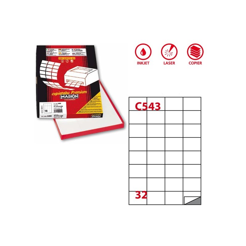 Scatola da 100 fogli di etichette in carta adesiva permanente in formato 21x29,7cm adatti per fotocopiatrici, stampanti laser, inkjet.