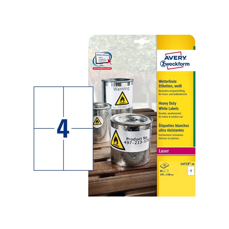 Etichetta in poliestere adesivo L4719 - adatta a stampanti laser - 105 x 148 mm - 4 et/fg - bianco - Avery - conf. 20 fogli A4