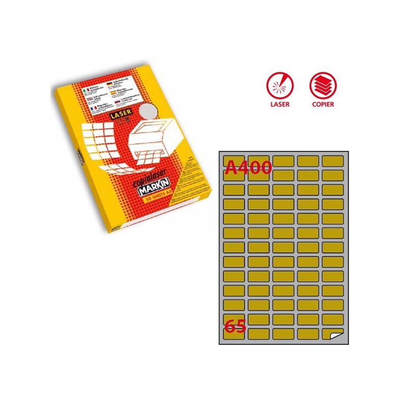 Scatola da 100 fogli A4 di etichette autoadesive permanenti in carta satinata oro. Etichette con angoli arrotondati. Stampabili solo con laser e fotocopy. Dimensioni etichette: 38,1x21,2mm. 65 etichette/foglio.