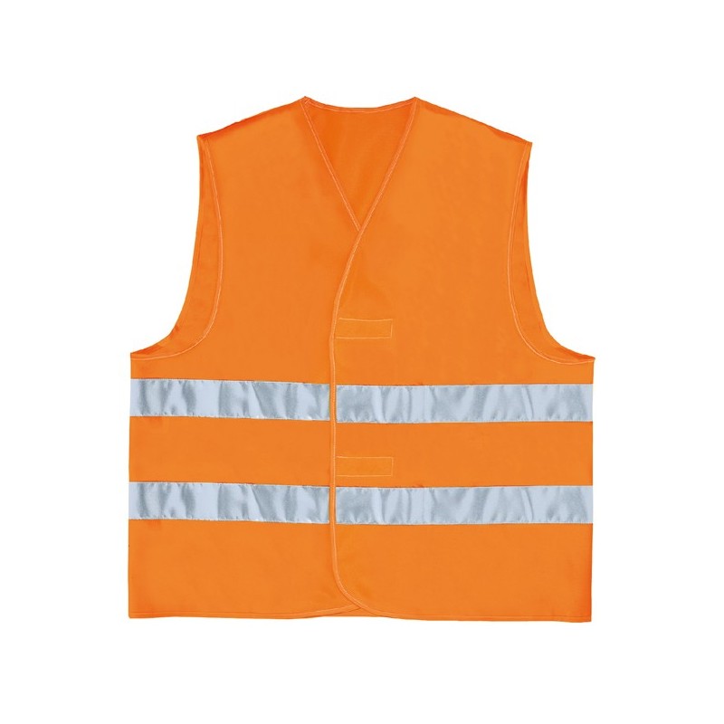 Gilet in poliestere con chiusura mediante fascia auto-stringente. Strisce retro-riflettenti cucite. Categoria DPI: 2. Certificazione CE. Conformità alle norme EN ISO 13688:2013 e EN ISO 20471:2013 /A1:2016.