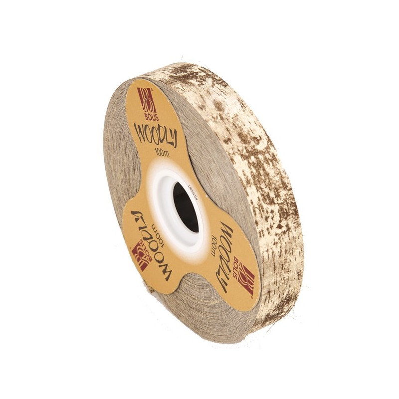 Linea Woodly nastro bifacciale di design naturale. Fantasia Corteccia color avorio. Rotolo da 100mt x h. 24mm.