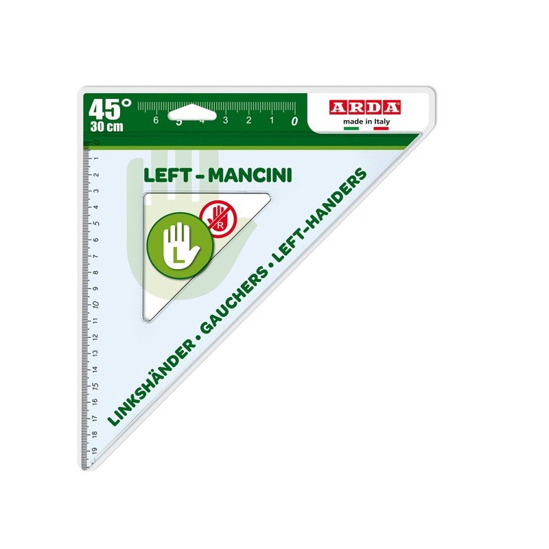 Squadra in materiale plastico. Smusso tirachina e bordo interno. Punte arrotondate di sicurezza. Con milimetratura speciale invertita da destra verso sinistra.