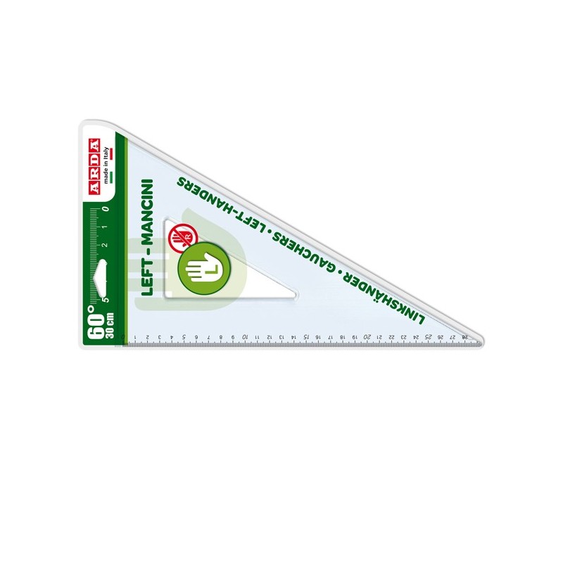 Squadra in materiale plastico. Smusso tirachina e bordo interno. Punte arrotondate di sicurezza. Con milimetratura speciale invertita da destra verso sinistra.
