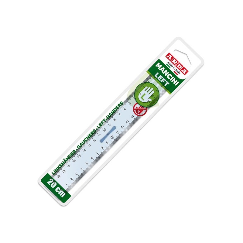 Doppiodecimetro in materiale plastico. 2 millimetrature impugnatura corta. Con milimetratura speciale invertita da destra verso sinistra.