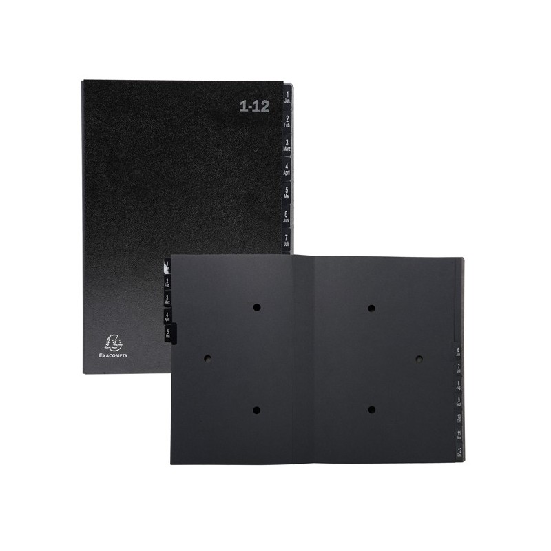 Copertina in cartone riciclato rigido 1.3 mm e tasti stampati. Interno in carta riciclata nera 270 g/mq con 2 fori per visualizzare il contenuto. Formato 25x33 cm per documenti A4.