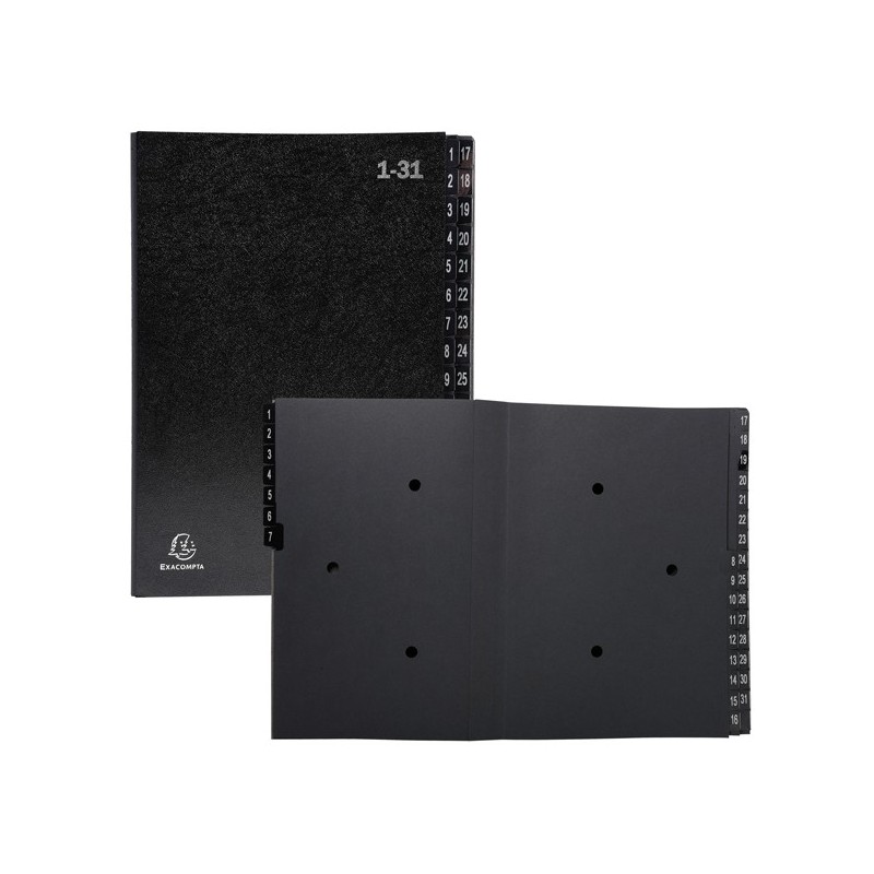 Copertina in cartone riciclato rigido 1.3 mm e tasti stampati. Interno in carta riciclata nera 270 g/mq con 2 fori per visualizzare il contenuto. Formato 25x33 cm per documenti A4.