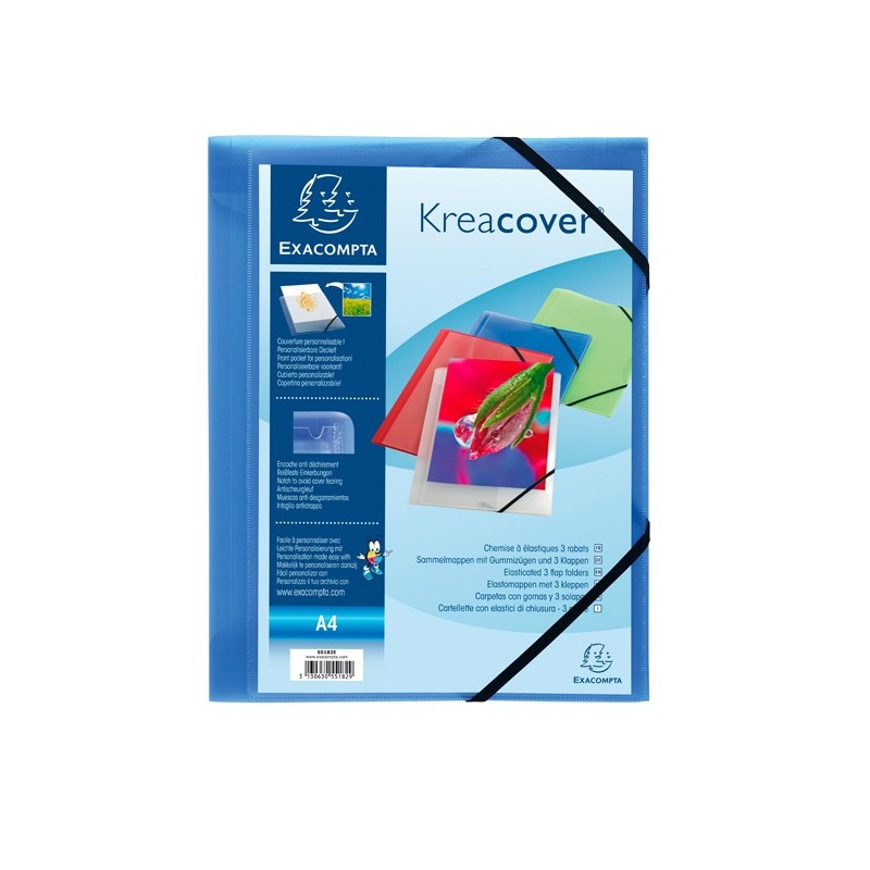 Cartellette 3 lembi con elastici di chiusura Ppl traslucido 500 micron - F.to 24x32 cm per A4. Colore blu.