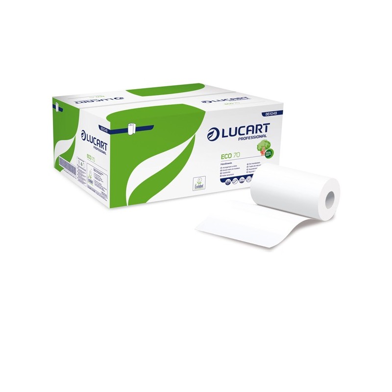 ASCIUGAMANO AD ESTRAZIONE INTERNA 100% in carta riciclata rigenerata. MICROGOFFRATO 2 VELI DA 18,5GR. ALTEZZA ROTOLO 22,8CM - DIAMETRO ROTOLO 13CM - LUNGHEZZA CARTA 70MT (190 STRAPPI DA 22,8X37CM).
