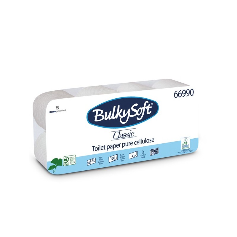 Carta igienica microgoffrata in 100% pura cellulosa bianca a 2 veli. In rotolo standard 16,8mt 160strappi. Diametro rotolo 10,5cm. Diametro anima 4,5cm. Strappo: 10x10,5cm.