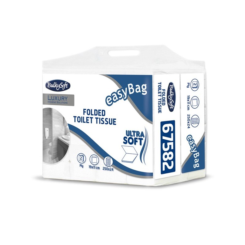 Carta igienica interfogliata goffrata diamante. In pura cellulosa 100% 2 veli. Dimensioni strappo: 11x19cm. 250 strappi. In confezione EasyBag: maneggevole, impermeabile, resistente.