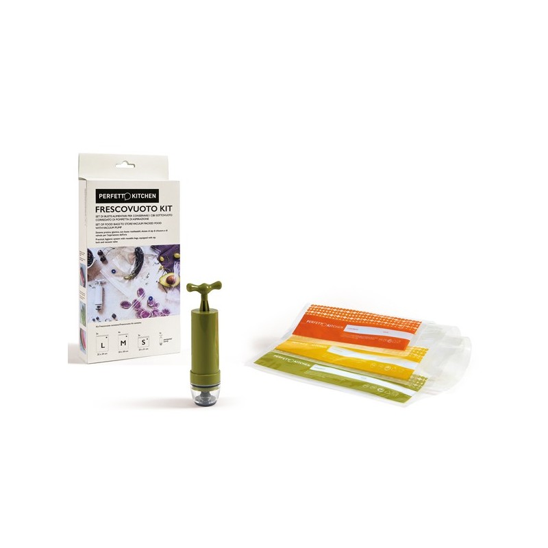 FrescoVuoto è il pratico e intelligente sistema per conservare tutti i cibi sottovuoto mantenendoli freschi fino a 20 volte più a lungo! Sistema facile e veloce da utilizzare quotidianamente per conservare carne, pesce, formaggio, ortaggi, frutta! StarPack: Pompetta + Buste sottovuoto assortite (2pz Small - 4pz Medium - 2pz Large).