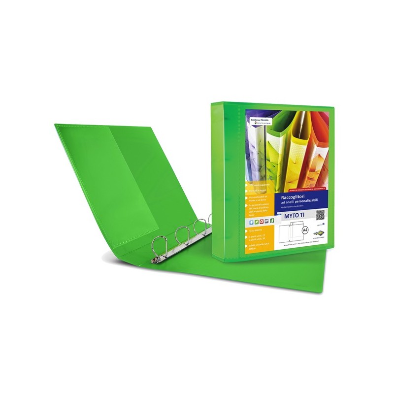 Raccoglitore personalizzabile in polipropilene colorato semitrasparente, con meccanismo a 4 anelli (a D). Dotato di tasche trasparenti sul 1° quadrante, sul dorso e all'interno. Inserimento facilitato della personalizzazione del dorso. Formato esterno: 275x320 mm. Formato contenuto: 220x300 mm (A4). Dorso: 40 mm. Diametro anelli: 30 mm. Colore verde.