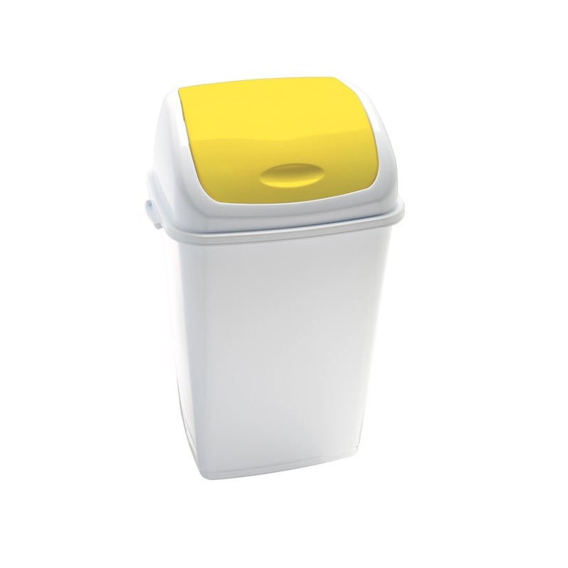 Pattumiera con coperchio basculante colore giallo in polipropilene ad alta densità. Il coperchio basculante è utile come fermasacco. Contenitore stabile e di facile manutenzione. Il coperchio colorato è ideale per differenziare la raccolta. Dimensioni: L44 x P33 x H68cm - capacità 50 litri. Pulizia periodica da effettuare con un panno morbido e non abrasivo, imbevuto d’acqua. Detergenti che contengono solventi possono danneggiare il materiale.