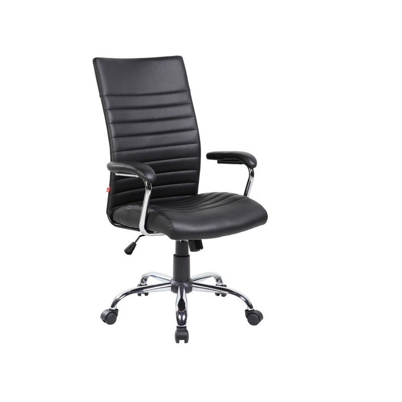 Poltrona a schienale alto rivestita in PU. Braccioli e base in acciaio con ruote in nylon. Meccanismo oscillante bloccabile. Manopola per la regolazione di tensione della spinta. Larghezza fuori tutto cm 65; Larghezza seduta cm 49; Profondità cm 63; Altezza cm 108/118; H.seduta cm 45-55.