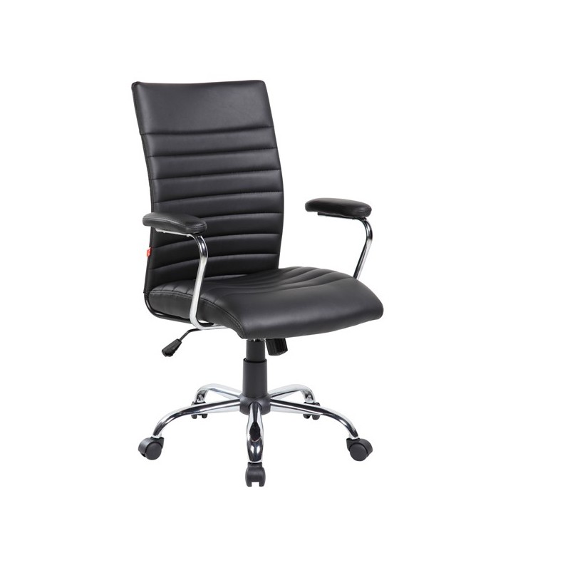 Poltrona a schienale medio rivestita in PU. Braccioli e base in acciaio con ruote in nylon. Meccanismo oscillante bloccabile. Manopola per la regolazione di tensione della spinta. Larghezza fuori tutto cm 64; Larghezza seduta cm 47; Profondità cm 57; Altezza cm 98/108; H.seduta cm 45-55.