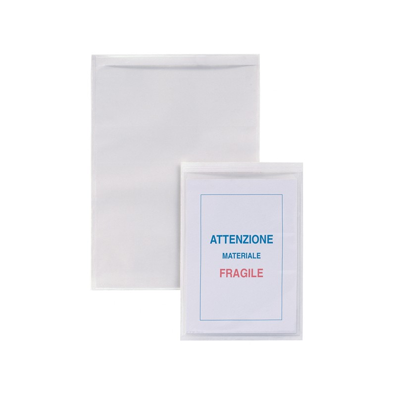 Tasca autoadesiva in PVC trasparente con chiusura ermetica. I fogli inseriti sono sigillati dal bordo superiore per proteggerli dalla pioggia e dalla polvere. Indicate per pacchi, buste, casse, regolamenti, istruzioni. Formato contenuto 150x210 mm (A5). Confezione da 5 tasche.